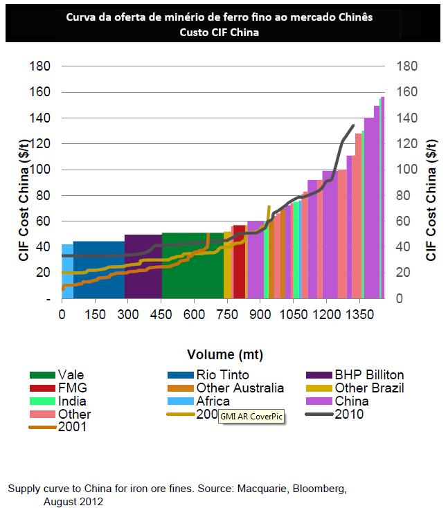O que o pessoal não fala é que se houver uma oferta maior do que a procura não será qualquer minério que será penalizado: apenas aqueles com custos operacionais elevados. É isso que vai ocorrer, como o Portal do Geólogo vem apontando em várias matérias. Neste quesito os mineradores brasileiros estão bem já que a maioria coloca o seu minério nos portos com preços entre 40 a 60 dólares por tonelada. Serão penalizados aqueles como os indianos e os chineses que não conseguem produzir minério de ferro a preços baixos. No gráfico mostra que existem 750 milhões de toneladas de minério de ferro, 50% da produção, que chegam na China acima de US$60/t.