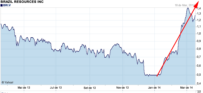 É lógico que tudo tem um custo e que esse custo será representado pelo all-in cash costs de cada jazimento e o lucro final será a diferença entre o preço de venda e esse custo, após a incidência dos impostos. Mesmo assim a Brazil Resources tem projetos com um valor presente muito significativo e foi, exatamente por isso, que suas ações subiram, que nem um foguete, após a compra das jazidas da Brazilian Gold Corp. (veja o gráfico).