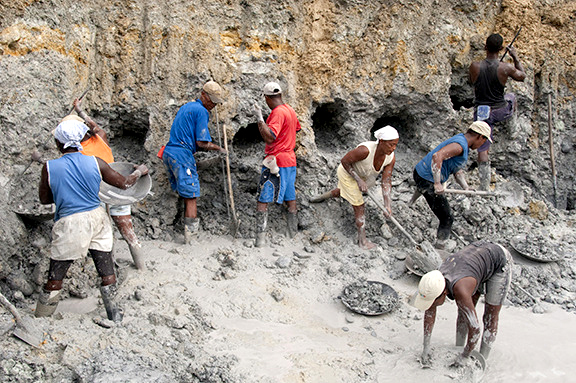 Garimpeiros lavram um conglomerado basal de aluvião em El Chocó na Colômbia. Esta prática manual está, rapidamente, sendo substituída pela mecanizada que devasta em horas o que os braçais levam meses.