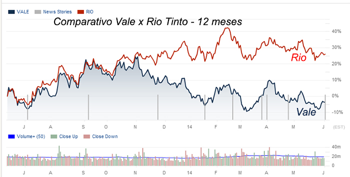 O gráfico não mente. No comparativo dos preços das ações das duas gigantescas mineradoras a Rio bate a Vale por uma margem enorme nestes últimos 52 meses. No período de 1 ano, desta comparação, a Rio cresceu 25% e a Vale caiu 8%, uma diferença a favor da Rio Tinto de 33%.
