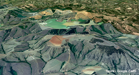 Tapira é um osso atravessado na garganta da Vale. Trata-se de um gigantesco depósito de titânio associado ao complexo carbonatítico de mesmo nome que já é conhecido dos geólogos brasileiros há várias décadas. Na parte superior do carbonatito houve o desenvolvimento de laterita com um depósito supergênico de titânio a base de anatásio (TiO2) com menores quantidades de perovskita e ilmenita (platô no primeiro plano). Se associam, também, ao carbonatito de Tapira, jazimentos de fosfato e de terras-raras. A jazida de fosfato está sendo lavrada. A operação é vista ao fundo da estrutura.