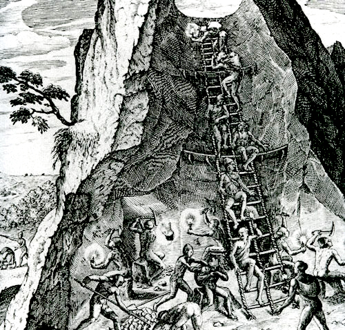 Na gravura vê-se a jazida de Cerro Rico, uma das mais famosas minas de estanho primário do mundo, e os indígenas locais sendo forçados a extrair a prata.