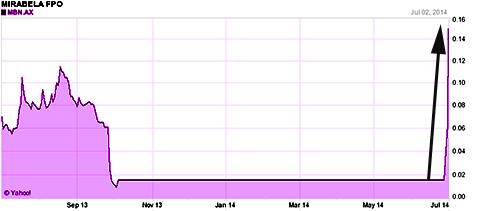A mineradora australiana Mirabela, após voltar a bolsa, está tendo um desempenho extraordinário, recuperando rapidamente o valor perdido ao longo do tempo. Ela subiu em três dias 650%. Somente hoje as ações já subiram 138% fechando, na Bolsa de Sydney, a $0,15.