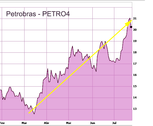 Em janeiro deste ano a PETR4 começou o ano em baixa, a 16,75. Hoje ela atinge um pico de 20,00, dando um retorno de quase 20% no ano.