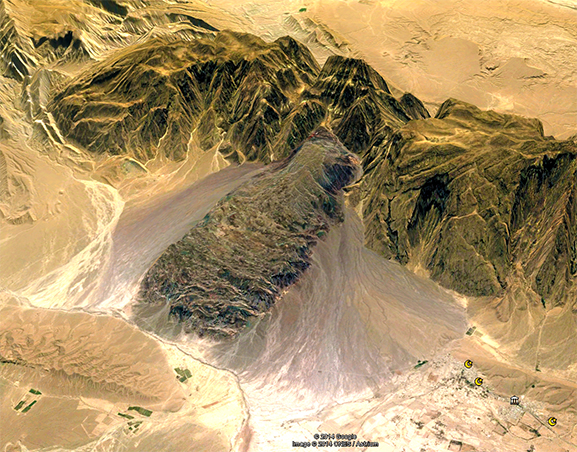 No foto ao lado é possível ver uma gigantesca massa salina, mais escura, com um formato de língua, que atravessou as rochas Proterozóicas do cinturão dobrado de Zagros no Irã, aflorando e descendo as encostas do vale por gravidade.