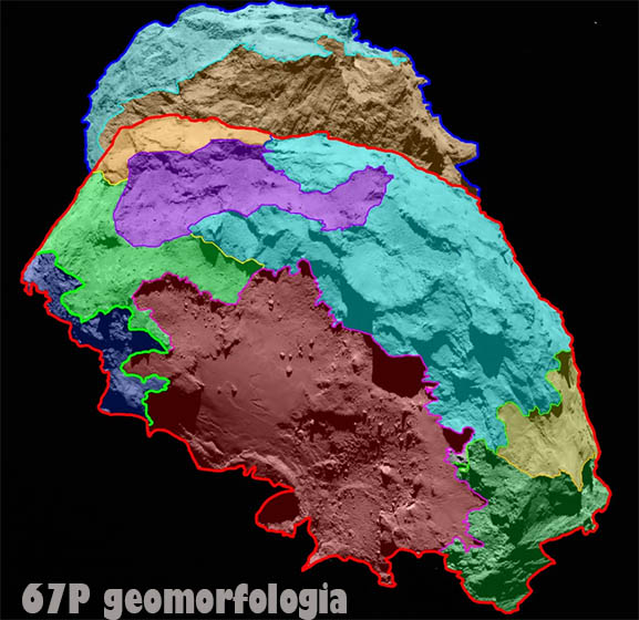 Desta forma foi feito o primeiro mapa geológico do 67P (imagem), onde foram mapeadas várias “regiões” com características geomorfológicas distintas. O mapa é fruto do trabalho de alta resolução da Osiris e é o primeiro passo na direção de um mapa geológico e suas camadas de geologia, geomorfologia, geoquímica que integrarão o primeiro GIS de um cometa.