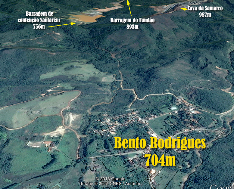 A ruptura da barragem de rejeitos do Fundão com dezenas de milhões de toneladas de lama, ocasionou, em sequência, o rompimento de Santarém uma pequena barragem de contenção situada a 3.000 metros de distância (veja na imagem).