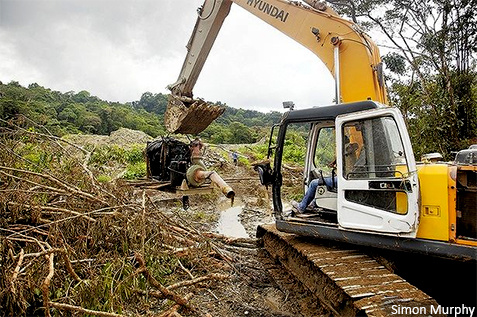 Garimpeiros lavram um conglomerado basal de aluvião em El Chocó na Colômbia. Esta prática manual está, rapidamente, sendo substituída pela mecanizada que devasta em horas o que os braçais levam meses.